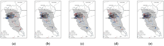 The local autocorrelation (LISA) aggregation plot reflects the degree of aggregation of the samples. The data aggregation was classified into four types according to the scatter plot: high–high (HH), high–low (HL), low–high (LH) and low–low (LL), where HH (LL) agglomeration indicates positive spatial autocorrelation between adjacent points and a high (low) spatial agglomeration of carbon intensity and LH (HL) indicates negative spatial autocorrelation between adjacent samples, with high (low) carbon emission samples surrounded by low (high) carbon emission samples [34]. The HH, LL, HL and LH clustering patterns of the samples were determined by importing the carbon emission vector file into GeoDa software, establishing a k-nearest neighbor spatial weight matrix and performing local autocorrelation analysis on the sample carbon emission data. These clustering patterns were exported to a vector file from the LISA clustering map and loaded into ArcMap 10.3 software to view and compare their distribution characteristics. The distribution characteristics of the clusters were compared in ArcMap 10.3.