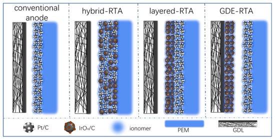 Firstly, 0.75 g catalyst was added into tube and wetted with 10.0 g deionized water, then 9 g Nafion ionomer and 30 g ethanol were added sequentially. Thereafter, the received ink was dispersed by high-speed shearing for at least 30 min, maintaining the temperature of the system below 10 °C. Next, catalyst-coated membranes (CCMs) were prepared by ultrasonic spraying, where the Pt/C loadings on the anode and cathode were 0.05 mg cm−2 and 0.3 mg cm−2, respectively, resulting in a normal MEA being obtained, with a conventional anode as a contrast. When it comes to MEA samples with different RTA configurations, the first approach is to prepare a common RTA by creating a hybrid Pt/C and IrOx/C catalyst layer (defined as hybrid-RTA), the second method is spraying IrOx/C ink onto the surface of the ACL to obtain a layer-by-layer reversal-tolerant CCM (named layered-RTA), and the last way is depositing IrOx/C onto the anode GDL to build a reversal-tolerant GDE (labeled as GDE-RTA). Specifically, the loading of IrOx/C is the same as for the anode Pt/C catalyst, at 0.05 mg cm−2, and all MEAs were pressed under 5 N m, with an active area of 50 cm2 (Figures S1 and S2). The structural schematic diagram and detailed description of the aforementioned MEAs are presented in Figure 1 and Table 1, respectively.