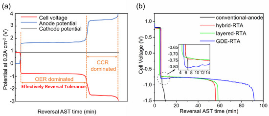 Reversal tolerance is one of the essential abilities for the practical application of MEAs, and the RTT makes sense for evaluating anode durability. As can be seen in the schematic diagram shown in Figure 2a, the cell voltage displays three platforms during reversal AST. The first platform at around 0.8 V terminates as soon as the anode runs out of H2; then, the second platform at around −0.8 V is an OER-dominated region where the water electrolysis reaction supplies protons to satisfy the cell circuit; and the last platform below −1.5 V is a CCR-dominated region. According to the voltage reversal failure criterion [27], severe CCR will be greatly accelerated when the cell voltage is below −1.5 V, and even more dramatic at more negative potentials. Pt nanoparticles will fall from the carbon support and aggregate—circumstances that will lead to the complete damage of the MEAs. However, fuel cells should be able to meet the requirement that they can be reloaded even when undergoing reversal operation. Herein, −1.5 V is defined as the termination of the AST in this work, because the OER-dominated region is effectively reversal tolerant, thus protecting MEAs from anode catalyst failure.