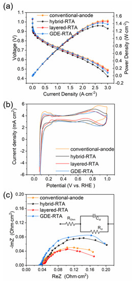 Although water electrolysis dominates the reaction in the range from −0.7 V to −1.5 V [20,33], cumulative degradation of the cell occurs during the reversal test as a result of carbon support corrosion, which can also be detected on the basis of the ECSA shrinkage in the anode. As shown in Figure 4b, three atypical CV curves were obtained for hybrid-RTA, layered-RTA, and GDE-RTA after the reversal AST, which can be attributed to mutual interference between the consequent sintering of Pt or IrOx nanoparticles. Although all CV curves present a distorted shape, the H desorption characteristic peak still reflects the HOR catalytic ability of ACL. The ECSA of the MEAs after AST shows the tendency GDE-RTA > hybrid-RTA > layered-RTA, which is in accordance with the polarization performance following the reversal test. Moreover, it can be observed that a much wider double electrode layer appears when IrOx/C is applied on GDL to prepare GDE-RTA, which is an indication that carbon support collapse in the separated Pt/C and IrOx/C layers is enlarging the interface interval to some extent. As shown in Figure S4 and Table S2, the cathode ECSA hardly changes following cell reversal, demonstrating that decreasing cell performance is only a consequence of anode degradation.