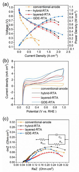 Electrochemical characterization of fresh MEAs: I–V and power density curves (a), cyclic voltammograms (b), and Nyquist diagrams (c).
