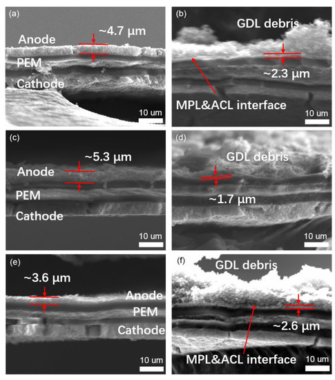 Cross-section images of fresh and aged MEAs with different RTA structures: fresh MEA sample for hybrid-RTA (a), layered-RTA (c), and GDE-RTA (e). MEA samples after reversal AST for hybrid-RTA (b), layered-RTA (d), and GDE-RTA (f).