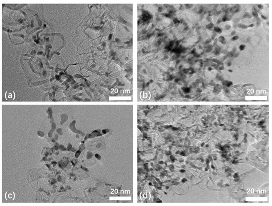 TEM was performed to investigate the sintering of the catalyst; Pt/C and IrOx/C powder were obtained from the catalyst layer using a slicker, and ultraphonically redispersed for sample preparation. For the BOT MEAs, the noble metal nanodots show a mean grain diameter of approximately 3.8 nm and a uniform distribution on the surface of c the arbon support (Figure 6a), whereas there is an obvious increase in the average particle size of the samples after reversal AST, in the order layered-RTA > hybrid-RTA > GDE-RTA. In this regard, aged layered-RTA possesses a maximum Pt or IrOx agglomeration of 7.3 nm (Figure 6c), which is in agreement with the SEM images, in which the sample exhibits the most severe ACL attenuation after the reversal test. Meanwhile, the active dot diameter of GDE-RTA rose to a mere 5.6 nm (Figure 6d), which validates the assumption that a separate OER catalyst layer on GDL may indeed mitigate carbon corrosion and catalyst sintering. In addition, the EOT hybrid-RTA possesses larger catalyst clusters, with a diameter of 6.0 nm (Figure 6b), than GDE-RTA, which can be explained by the fact that randomly distributed Pt nanoparticles promote the carbon corrosion of IrOx/C [28,29,30,31]. Moreover, the carbon supports of the three aged ACLs exhibit vague shapes, especially for layered-RTA, and this finding is consistent with CCR during the cell reversal.