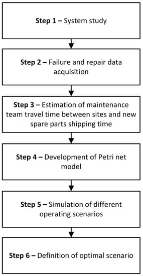 Figure 1 presents the step-by-step procedure proposed in the current work for the development of the GSPN model, which in turn will be used for estimating the influence of the number of spare parts and maintenance teams on the availability of the considered systems, thus allowing the optimization of costs related to maintenance and, consequently, maximizing the enterprise’s profit.