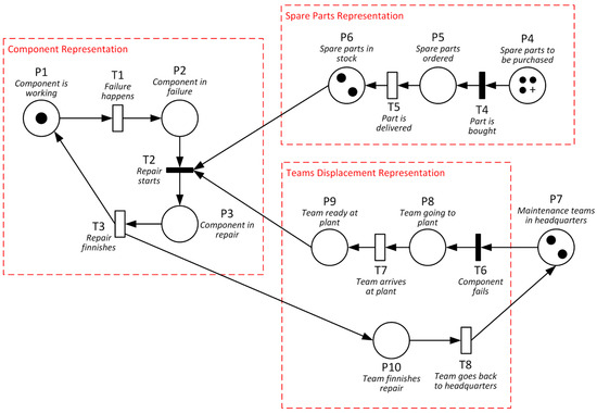 It is important to consider, however, that in some cases, several assets from different plants/locations must be represented simultaneously by the model. In such cases, the structures previously described, including the number of places and transitions for each representation, are replicated as many times as necessary in the GSPN model.