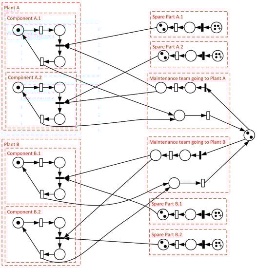 To better exemplify how to use the structures/modules shown in Figure 2, a GSPN is presented in Figure 3, which represents two plants, each one with two assets. In this figure, four types of spare parts are represented (A.1, A.2, B.1, and B.2) and each type has two pieces in stock. In addition, there are two maintenance teams available that can be mobilized to repair a component at either of the two plants.
