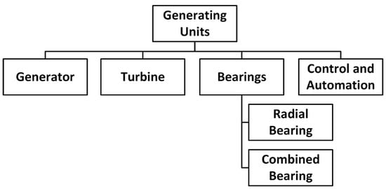 As proposed by the method previously presented in Section 3, the first step that needs to be taken is to study the systems that will be analyzed. In this case, the two considered SHPPs, named “Plant A” and “Plant B”, are capable of generating, respectively, 25 MW and 29.5 MW. The two plants are located in the same stream, being plant A located upstream from plant B. Each plant has three generating units (Gus), of which the main components considered in this work are the generator, the turbine, the bearings (one radial bearing, on the turbine side, and one combined bearing, on the generator side, which joint the functions of a guide bearing and a thrust bearing), and the control and automation (C&A) system. Functionally there are no differences between the units and, therefore, a single functional tree can represent them, as shown in Figure 4.