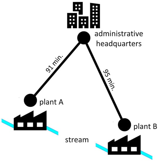 The third step in the proposed method is the estimation of maintenance team travel time between sites and new spare parts shipping time. Regarding the former, the considered SHPPs are compact facilities with a semi-autonomous operation, leading to a minimal need for in-house personnel. Thus, the operation can be carried out remotely from a headquarters located in a nearby city whose distance is approximately 60 km for Plant A and 70 km for Plant B. Maintenance teams remain in the same headquarters, on standby for any eventuality at the plants while performing routine activities. Thus, in the event of an alarm from the Supervisory Control and Data Acquisition (SCADA) system of one of the plants, one of the maintenance teams available at the headquarters moves to the plant with the unit in a fault condition. The route includes dirt roads and highways, and the travel time between the headquarters and each plant is shown in Figure 5.