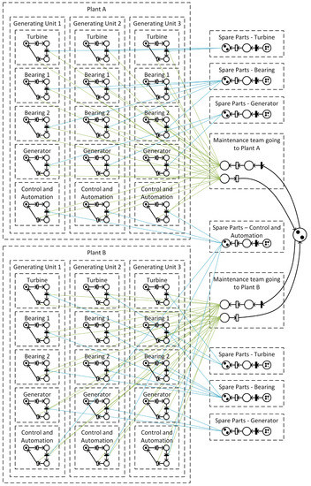 After collecting the data from steps 2 and 3, the fourth step of the method is the development of the PNs according to the proposed method. Figure 6 presents the GSPN structure used to represent each asset, each spare part, and each maintenance team in the model. The GSPN presented uses the proposed structures to represent the SHPPs under study. In total, there are thirty assets represented, located in the two SHPPs. The arcs in blue (connecting spare parts modules with component modules) and in green (connecting maintenance teams modules with component modules) are colored to try to facilitate the visualization of the GSPN, since the total number of arcs ends up making it difficult to understand. The GSPN was developed in a Petri net software called GRIF [30], which was used to run the model.
