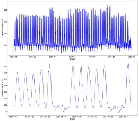 Power demand data for the Student Services Center building for (top) the complete year dataset and (bottom) two weeks during the academic year.