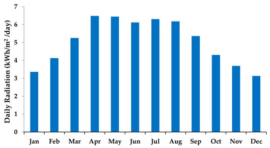 Solar irradiation is an important criterion for determining PV performance outcomes. This study used the global horizontal irradiance 8760 h time series as input in HOMER to design and model the HES. Figure 2 shows the average monthly solar irradiance data obtained from the NASA Weather Resource Data Center [36]. The daily average solar irradiation received in San Diego, California is relatively high at 5.0 kWh/m2/day, making solar energy systems attractive energy sources.