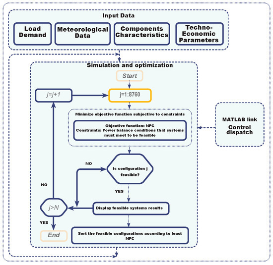 Step 3: Simulation results. HOMER analyzes a set of different system configurations. In the enumerative optimization process, HOMER examines all possible combinations, discards infeasible options that are unable to meet the given constraints, and then displays a list of feasible options and sorts them according to the optimization variable of choice (NPC) [37].