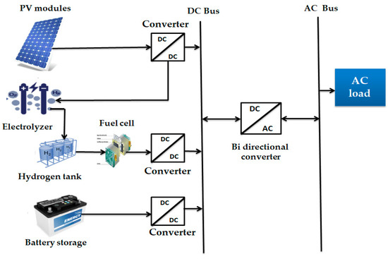 The proposed HES consists of a PV, FC, BES, HT, and EL, as shown in Figure 4. The PV, FC, BES, and EL were linked to the DC bus, while the load demand was connected to the AC bus. The EL uses electricity from the PV panels to generate hydrogen, which is stored in the HT. However, the power electronics used to connect the system components were not considered in this study. The technical parameters and economic data were obtained from the literature [38,39,40] and are listed in Table 2. The project lifetime was assumed to be 25 years. An inflation rate of 2% and discount rate of 8% [36] were also assumed.