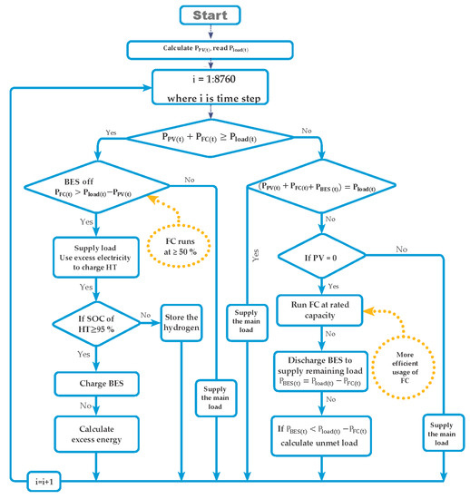 - The PV + FC can satisfy the load demand, and the remaining power to satisfy the load demand is provided by the FC. The minimum load ratio of the FC was set to 50% of its capacity to prevent the FC from operating under a low load with low efficiency. The authors [46] found that when the partial-load demand was larger than 51.1%, the electrical efficiency increased, whereas a low-partial load decreased the electrical efficiency. Therefore, if the required electricity from the FC is less than 50% of its capacity, then the FC operates at 50%. The difference between power generation and power demand is then . If then the remaining power is fed to the EL (PEL(t) = ∆P(t)) to produce hydrogen for storage. If the power fed to the EL is greater than the power rating of the electrolyzer (PrEL), the remaining power is used to charge the BES.