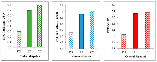 Net present cost, CAPEX, and OPEX for PD, LF, and CC control dispatch.