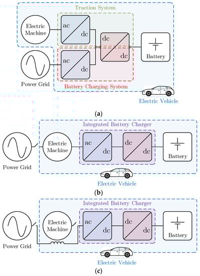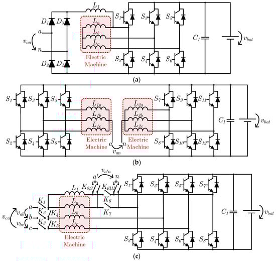EV power electronics structure: (a) conventional; (b) integrated using the machine windings as coupling filters with the power grid; (c) integrated using external inductors as coupling filters with the power grid.