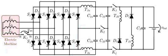 In 2018, S. Semsar et al. proposed a similar system, as shown in Figure 17a [35]. This system is capable of charging both batteries from a single-phase ac power grid (terminals a, n), using an additional diode full-bridge single-phase ac–dc converter (D1–D4) and a contactor (K1) that should be closed in battery charging mode. In traction mode, K1 is open, and the resulting power electronics system is the same as in the IBC previously shown. In battery charging mode, the voltage after the diode full-bridge single-phase ac–dc converter, i.e., the rectified van is the sum of the voltages produced by each shared leg of the two three-phase ac–dc converters, which, in this case, operate as PFC converters in conjunction with the diode bridge. The authors note that interleaved operation is possible in order to reduce the current ripple, but do not present details of this operation. Hence, when connected to a single-phase ac power grid, the currents in both batteries contain a high ac component, which is not desirable in these types of elements. In order to absorb a sinusoidal current from the power grid, each converter is responsible for each half cycle, with the upper converter (S1–S6) synthesizing the positive current half cycle and the bottom converter (S7–S12) synthesizing the negative current half cycle.
