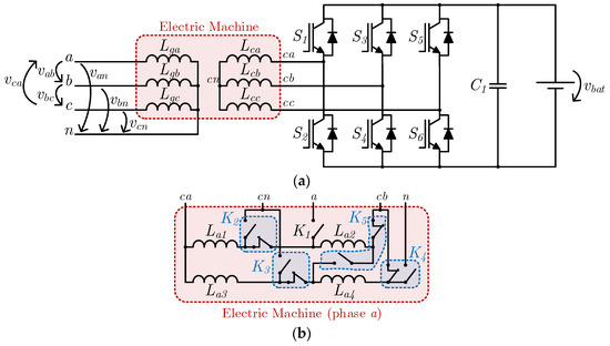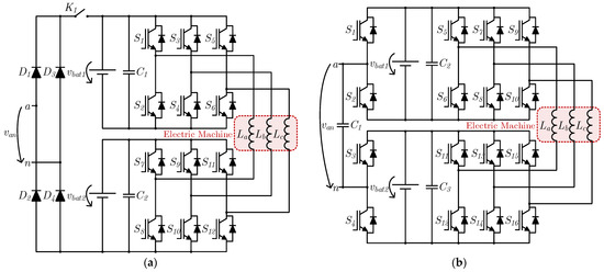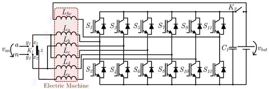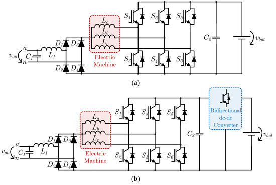 In 2015, D. G. Woo et al. proposed an IBC based on two electric machines for interfacing with single-phase ac power grids, as shown in Figure 16a [33]. This topology is composed of two three-phase three-leg bidirectional ac–dc converters (S1–S6 and S7–S12), with each ac side connected to the stator windings of each electric machine, and the dc link is shared between these converters and connected to a bidirectional buck–boost dc–dc converter (IGBTs S13, S14 and inductor L3), which in turn interfaces with the battery. In battery charging mode, the three-phase ac–dc converters operate as boost dc–dc converters, with each converter operating in a power grid half cycle, and the stator windings of each machine are used as inductors in each converter. Furthermore, between the neutral point of each electric machine and the connection terminals to the power grid, two contactors (K1 and K2), two inductors (L1 and L2) and two diodes (D1 and D2) are used, where the diodes are used to reduce the common-mode noise, connecting the system ground to neutral (terminal n) during the power grid positive half cycle or to the phase (terminal a) during the power grid negative half cycle. The inductors are applied in order to compensate for the small common-mode inductance values of the stator windings.
