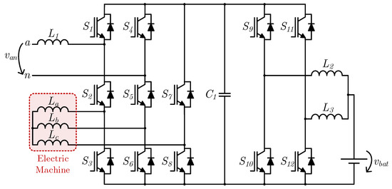 In 2013, O. Hegazy et al. proposed the IBC presented in Figure 5, which is based on an eight-switch three-phase ac–dc converter (S1–S8) and a two-phase interleaved buck–boost dc–dc converter (S9–S12), both bidirectional [17]. The ac–dc converter is composed of three legs, one of them with two switches (S7 and S8) and the other two with three switches (S1–S6). This approach allows a three-phase three-leg bidirectional ac–dc converter (S2, S3, S5, S6, S7, S8) to be simultaneously established with a full-bridge single-phase bidirectional ac–dc converter (S1, S2, S4, S5 or S1, S3, S4, S6), connected with a three-phase electric machine and a single-phase ac power grid (terminals a, n), respectively. Since the electric machine and the power grid are connected to different terminals of the ac–dc converter, no system reconfiguration is necessary in order to change the operation mode between machine drive and battery charging, and hence no relays or contactors are used. The only additional element is an inductor (L1), serving the purpose of interfacing the converter with the power grid. In order to guarantee the proper operation of the converter, IGBTs S1 and S4 are kept permanently closed in traction mode so that current flow in the three-phase three-leg bidirectional ac–dc converter (S2, S3, S5, S6, S7, S8) is allowed, while in battery charging mode IGBTs S2 and S5 (or S3 and S6) are kept permanently closed in order to allow current flow in the full-bridge single-phase bidirectional ac–dc converter (S1, S2, S4, S5 or S1, S3, S4, S6), while the third leg (S7 and S8) is kept permanently open.