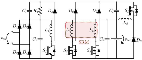 In 2000, C. Pollock and W. K. Thong proposed an IBC based on a two-phase SRM [18], as shown in Figure 6. As well as the converter that is typically used for traction systems in this type of machine (asymmetrical dc–ac converter), in this case of the two-phase type (comprising metal oxide semiconductor field effect transistors (MOSFETs) S2, S3 and diodes D6, D7), it also uses an energy recovery circuit (inductor L2, capacitor C4, MOSFET S4 and diode D8), an additional inductor (L1) coupled to one of the machine phases (in this case, La) with the respective diode (D5) and IGBT (S1) and a diode full-bridge single-phase ac–dc converter (D1–D4) for interfacing with a single-phase ac power grid (terminals a, n). The additional inductor L1 is only used in battery charging mode, making the system operate as a flyback isolated dc–dc converter. In addition, capacitor C1 and resistor R1 form an RC snubber and are also only used in battery charging mode.