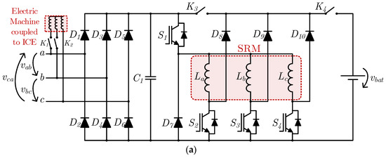 In 2014, Y. Hu et al. proposed an IBC for plug-in hybrid vehicles based on three-phase SRMs [21]. This topology is shown in Figure 8a. It is composed of an asymmetric dc–ac converter based on n + 1 switches (S1–S4) and n + 1 diodes (D7–D10), where n is the number of machine phases. This converter is also known as a Miller converter and is an alternative to the more commonly used version for SRM drives, in which 2n switches and 2n diodes are used. By adding a diode full-bridge three-phase ac–dc converter (D1–D6) and two contactors (K3 and K4), the asymmetric converter can operate as a dc–ac converter for driving the machine or as a buck dc–dc converter, where the machine stator windings behave as output inductors and the battery current is divided between the three windings. The input of the diode full-bridge three-phase ac–dc converter (terminals a, b, c) can be used for interfacing either with a power grid (single-phase ac, three-phase ac or dc) or a generator mechanically coupled with the internal combustion engine (ICE) of the vehicle via contactors K1 and K2. These contactors are closed whenever the ICE-coupled generator is used, as is the case for generator-only driving and hybrid driving in traction mode. Contactor K3 is used in traction mode, either in generator-only driving, battery-only driving or hybrid driving, and should be kept open in battery charging mode in order to establish a buck dc–dc converter. Contactor K4 is closed whenever the battery is used, either in traction mode (in battery-only driving and hybrid driving modes) and in battery charging mode.