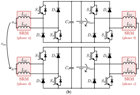 In 2015, the same authors proposed the IBC presented in Figure 8b, for application in EVs or plug-in hybrid vehicles, based on four-phase SRMs with two sets of stator windings [22]. Two asymmetrical converters with 2n switches and 2n diodes are employed, with each one applied to two machine phases, and a battery set is connected to the dc link of each converter. Hence, each of these converters can operate independently in traction mode. Regarding the battery charging mode, this topology allows operation with dc and single-phase ac power grids, where both converters are connected to each other in two of the phases (b, c) and the other two (a, d) operate as connection terminals to the power grid (terminals a, n). In the case of a dc power grid, the converters operate as two cascade-connected split-pi unidirectional buck–boost dc–dc converters, whereas in the case of a single-phase ac power grid the converters operate as a five-level cascaded h-bridge ac–dc converter (despite having more semiconductors than necessary). In both cases, due to the boost operation of the converter from the power grid to each set of batteries, the power grid peak voltage should be lower than the battery voltage for proper operation in battery charging mode.