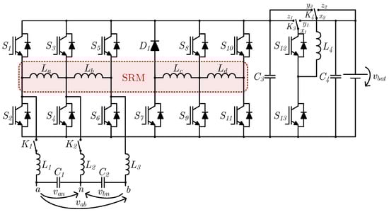 K.W. Hu et al. proposed, also in 2015, an IBC with additional operation modes, namely, vehicle-to-grid (V2G) and vehicle-to-home (V2H) [23] modes. This topology can be seen in Figure 9 and is based on a four-phase SRM and an asymmetric dc–ac converter similar to the one presented in 2011 [20] with five switch legs (S1–S6 and S8–S11) but also with an extra leg comprising a diode (D1) and a switch (S7). Moreover, a bidirectional buck–boost dc–dc converter is used (IGBTs S12, S13 and inductor L4), which may be reconfigured to operate in buck or boost mode in each direction, depending on the states of the three-position switches K3 and K4. In traction mode, these switches are configured in order to connect points x1, x2 to points y1, y2, respectively, linking the higher voltage side (leg formed by S12, S13) to the battery and linking the lower voltage side (inductor L4) to the asymmetrical dc–ac converter dc link. In this regard, when the intention is to drive the machine, the bidirectional buck–boost dc–dc converter operates in buck mode during regular traction mode and in boost mode during regenerative braking, and hence the battery voltage must be higher than the dc link voltage of the asymmetrical dc–ac converter. On the other hand, in battery charging mode, the switches K3, K4 are configured in order to connect points x1, x2 to points z1, z2, respectively, linking the higher voltage side (leg formed by S12, S13) to the asymmetric dc–ac converter dc link and linking the lower voltage side (inductor L4) to the battery. In battery charging mode, the bidirectional buck–boost dc–dc converter operates in buck mode during the conventional battery charging operation, i.e., in grid-to-vehicle (G2V) mode, and in boost mode during V2G or V2H operation modes, and therefore the dc link voltage must be higher than the battery voltage. The battery charging operation can be performed via a single-phase or a two-phase (using only one phase-to-phase voltage) ac power grid, where a single-phase three-wire bidirectional ac–dc converter is used, which is implicit in the asymmetric dc–ac converter (S1–S6). In order to connect the system to the power grid, two contactors (K1, K2), three inductors (L1, L2, L3) and two capacitors (C1, C2) are used, where the three-wire interface (terminals a, n, b) allows two phase-to-neutral voltages (van, vbn) and a phase-to-phase voltage (vab) to be obtained.
