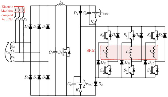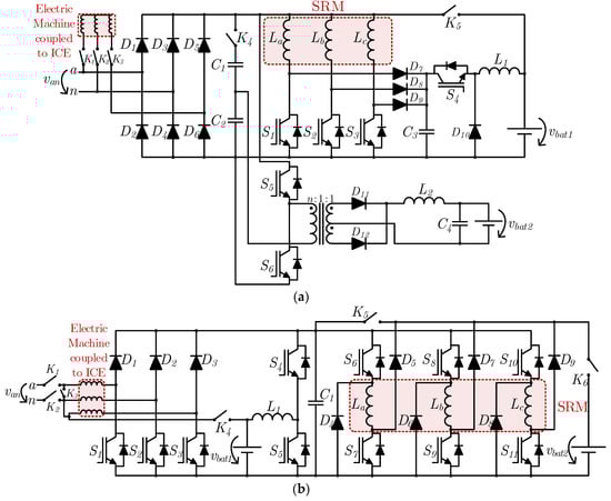 In the same year, the same authors proposed a similar system in which the electric machine coupled to the ICE is also an SRM (Figure 11b) [26]. In this case, the converter used to drive the ICE-coupled machine is the same as the converter used to drive the main machine in the previous proposal, with the main difference that the windings can be reconfigured to be connected to a common neutral or isolated via contactor K3. Similarly, interfacing with a single-phase power grid is feasible, and the topology also allows charging of both the traction and auxiliary batteries. As well as the converter for driving the ICE-coupled electric machine (IGBTs S1–S3 and diodes D1–D3), this system uses a typical asymmetrical dc–ac converter to drive the main SRM (IGBTs S6–S11 and diodes D4–D9) and a bidirectional buck–boost dc–dc converter (IGBTs S4 and S5 and inductor L1) interfacing with the traction battery (vbat1). The system uses six contactors, where K1 and K2 are used to interface the converter with a single-phase ac power grid, K3 is used to create the neutral point of the ICE-coupled SRM as noted, K4 is used to charge the traction battery from the ICE-coupled SRM, K5 is used to drive the main SRM and K6 is used to charge the auxiliary battery (vbat2). On this basis, there are five possible operation modes during traction operation, namely: (1) battery-only driving, where the vehicle behaves as an EV; (2) ICE-coupled SRM-only driving, where the power generated by the SRM is sufficient to drive the main SRM; (3) ICE-coupled SRM and battery hybrid driving, where the power to the main SRM comes from the two sources mentioned; (4) ICE-coupled SRM driving and battery charging, where the power generated by the SRM is more than the power required to drive the main SRM, and thus the surplus power is used to charge the traction battery; (5) regenerative braking, where the main SRM acts as a generator and charges the traction battery. Furthermore, during the battery charging operation (when the vehicle is stationary) there are three possible operation modes: (1) traction battery charged from the power grid; (2) auxiliary battery charged from the power grid; (3) auxiliary battery charged from the traction battery.
