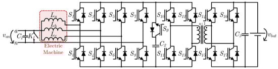 In 2020, Z. Wang et al. proposed the galvanically isolated IBC presented in Figure 14 [31]. This topology is composed of a four-leg three-phase ac–dc converter (S1–S8), an active snubber in the dc link (S9 and C2) and a dual active bridge dc–dc converter (S10–S17), where the galvanic isolation is ensured. In traction mode, the ac–dc converter only operates with three legs during normal conditions; the fourth leg (S7 and S8) is only used in fault-tolerant operation, in which contactor K1 is kept closed. In battery charging mode, the neutral point of the machine windings is used to connect to the phase terminal of a single-phase ac power grid, where the midpoint of the fourth leg is connected to neutral. This IBC allows bidirectional operation with the power grid and has a small capacitance value for the dc link capacitor C2 due to the active snubber. In addition, owing to the voltage conversion ratio of the dual active bridge dc–dc converter, a low-voltage battery can be used.