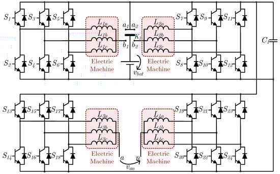 In 1995, S. K. Sul and S. J. Lee proposed an IBC for an all-wheel-drive EV, containing four electric machines and four three-phase three-leg bidirectional ac–dc converters, as well as a switch with two terminal pairs used for selecting the connection point of the positive battery terminal [32]. This topology can be seen in Figure 15. In traction mode, each ac–dc converter controls each electric machine independently, endowing the EV with all-wheel drive, with K1 connecting the batteries to the dc link terminals of all converters (terminals a1, a2). In battery charging mode, each group formed by two ac–dc converters and two electric machines is used to employ two bidirectional interleaved converters, namely, a buck–boost dc–dc converter (S1–S12) and a full-bridge single-phase ac–dc converter (S13–S24) for interfacing with a single-phase ac power grid (terminals a, n). In this case, the neutral points of two of the electric machines are used for interfacing with a single-phase ac power grid, while the neutral points of the other two electric machines are connected to the positive battery terminal by means of the switch (terminals b1, b2). The utilization of two converters in battery charging mode allows the power grid peak voltage to be higher or lower than the battery voltage, provided it is lower than the dc link voltage due to the boost operation of the dc–dc converter from the battery to the dc link.
