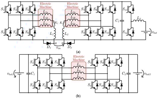 EV IBCs based on two traction converters proposed by S. Semsar et al. in: (a) 2018 [35]; (b) 2020 [36].