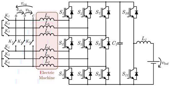 In 2016, M. Diab et al. proposed an IBC based on a nine-switch ac–dc converter capable of controlling a six-phase machine [37]. This IBC is represented in Figure 18, where it can be seen that the nine-switch converter (S1–S9) is based on three legs with three semiconductors each, similar to two regular three-leg three-phase ac–dc converters on top of each other, where the bottom semiconductors of the upper converter are the same as the upper semiconductors of the bottom converter (S2, S5, S8). Hence, six midpoints can be found, to which the windings of the six-phase machine are connected. This IBC has also a bidirectional buck–boost dc–dc converter (semiconductors S10 and S11 and inductor L1) interfacing the dc link capacitor C1 with the battery, as well as three sets of three-phase contactors to reconfigure the system. In traction mode, contactors K1–K6 are closed, in order to connect the neutral points of each group of machine windings, creating two neutral points in the six-phase machine. In battery charging mode, these contactors must be kept open, and K7–K9 are closed. The intermediate semiconductors of each leg (S2, S5, S8) are kept closed, so that the nine-switch converter operates as a regular three-leg three-phase ac–dc converter, with each pair of machine windings being connected in parallel (La with Ld, Lb with Le, Lc with Lf). This topology allows bidirectional operation with the power grid.