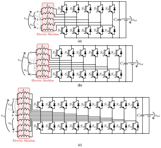 EV IBCs proposed by I. Subotic et al. and V. Katic et al. in 2016 [38,39,40] based on electric machines with phase counts equal to: (a) five; (b) six; (c) nine.