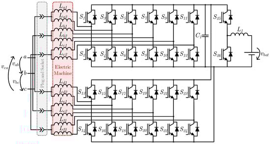 In 2020 also, H. Raherimihaja et al. proposed an IBC based on a six-phase open-end winding machine [46]. As illustrated in Figure 21, this topology is composed of a twelve-leg inverter (S1–S24) to drive the electric machine, as well as an additional leg (S25 and S26) and inductor (L1) that form a bidirectional buck–boost dc–dc converter to connect the inverter dc link to the battery. Instead of using contactors, this system contains a plug and socket to connect the machine terminals to a three-phase ac power grid. The machine windings are connected in pairs, and in this case (battery charging mode), two pairs of windings are connected to each other, where the midpoint of each pair is connected to a given phase of the power grid. With this configuration, it is possible to achieve a four-phase interleaved bidirectional three-phase ac–dc converter, since the twelve inverter legs can be used in an arrangement of four legs per power grid phase. Despite mentioning this feature, the authors do not employ this interleaved operation in the same paper. This system allows bidirectional operation with the power grid, and since it uses a six-phase machine, it allows a battery charging power twice that of the traction power, as well as having fault tolerance capability. In 2021, the same authors proposed a similar system based on a nine-leg inverter and a three-phase nine-winding machine [47], as well as giving a detailed analysis of the design of this type of machine for use in IBCs [48].