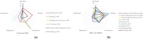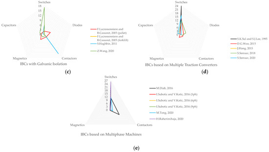 In order to establish a comparison between the IBCs in quantitative terms, Figure 22 presents five radar charts, where the number of switches, diodes, contactors, magnetics and capacitors is represented. Due to the high number of presented IBCs and in order to better analyze the provided information, five radar charts were used instead of a single chart, with each one representing a subsection of Section 2. Figure 22a represents the classical IBCs (Section 2.1), Figure 22b the IBCs for SRMs (Section 2.2), Figure 22c the IBCs with galvanic isolation (Section 2.3), Figure 22d the IBCs based on multiple traction converters (Section 2.4) and Figure 22e the IBCs based on multiphase machines (Section 2.5). The term “switches” refers to fully controlled semiconductors, either IGBTs, MOSFETs or bipolar junction transistors, with or without antiparallel diodes, while the term “diodes” refers to this single component, excluding the antiparallel diodes present in fully controlled semiconductors. “Magnetics” can refer to either inductors or transformer windings, excluding electric machine windings (e.g., one transformer with one primary and one secondary winding contributes two to the magnetics count). The term “capacitors” only counts each capacitor set (as in the capacitor numbering in the IBC figures). It should be noted that Figure 22e has only three comparative metrics, namely, switches, magnetics and contactors, since the diode count is nil and the capacitor count is one for all the topologies presented in this figure.