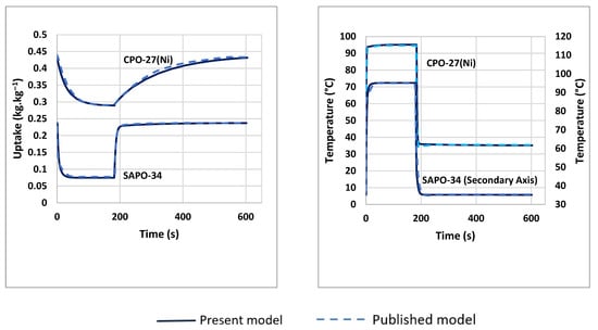 The uptake and temperature temporal variations for CPO-27(Ni) and SAPO-34 adsorbent materials obtained from the present model and reference [11].