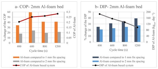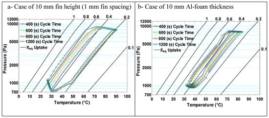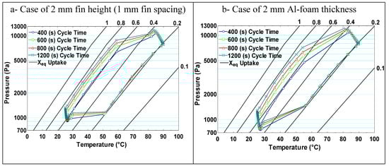 Spatial and temporal variations of the temperature and uptake during the first 90 s of the adsorption process for the bed modelled tube are shown in Figure 4 for finned-tube and Al-foam beds. The numerical simulation is shown for a 5 mm fin height/foam thickness and cycle time of 400 s. At the starting time of 0 s, the bed just finished the precooling process, and the tube starts to receive the vapor from the evaporator at the valve opening boundary condition. The role of fins and aluminum foam in intensifying the heat transfer within the adsorbent domain is shown in Figure 4a,b. It can be deduced that a more effective decrease in the bed temperature directly increases the bed uptake and improves the system performance. In detail, the average temperature of the adsorbent domain at 90 s is 26.67 °C for the finned-tube bed compared to 31.21 °C for the Al-foam bed, resulting in an average uptake of 0.363 kg/kg and 0.332 kg/kg for the finned-tube bed and Al-foam bed, respectively. Consequently, and after completing the cycle of 400 s, the DIP of the finned-tube based system and Al-foam based system attained 114.3 and 110 kgice·day−1, respectively. The increase in the DIP of the finned-tube based system over the Al-foam based one was attributed to the lower bed temperature in the former system during the adsorption process in the given case. The net effects of fin height and spacing against the foam thickness at different cycle times on the overall performance of the adsorption ice production system will be discussed in the next sections.