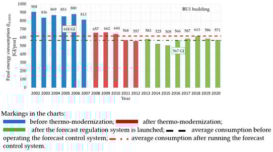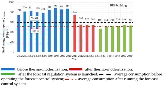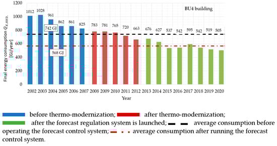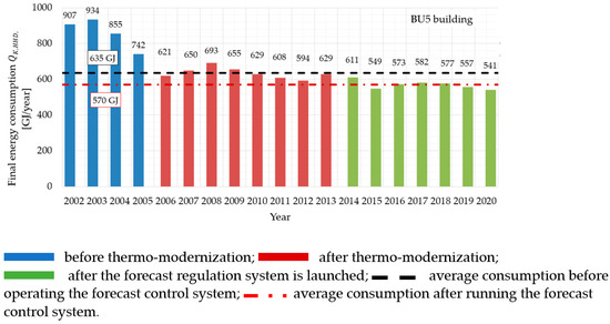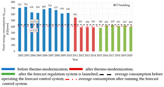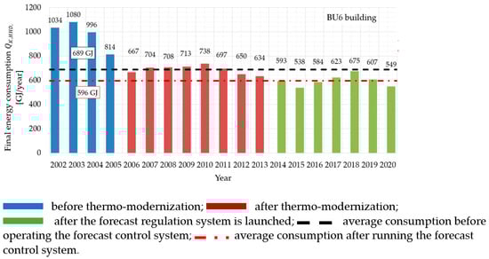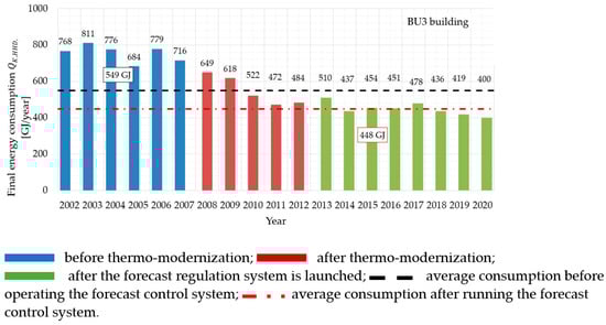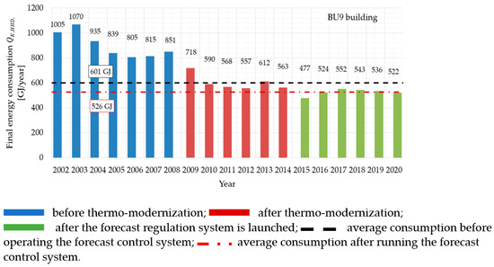 The study of thermal energy consumption (final energy) for heating a building covers three periods. The first one is the time before the thermo-modernization is carried out, the second one is years after the implementation of deep thermal modernization and the third one covers the years after the installation of the forecast regulation system.