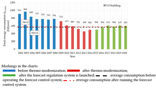 The period before deep thermal modernization (Table 1) covers the years 2003–2007 for BU1–BU3 buildings, 2002–2007 for BU4 buildings, 2001–2005 for BU5-BU6 buildings, 2001–2011 for BU7 buildings and 2003–2009 for buildings BU9 and BU10.