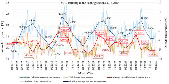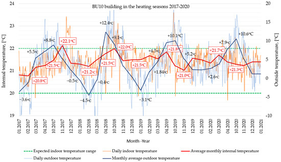 Measurement of thermal energy for central heating in each of the BU1–BU10 buildings was measured with ultrasonic heat meters located in individual heat substations in each building. The study of heat consumption solely for heating purposes covered the years 2002–2020.