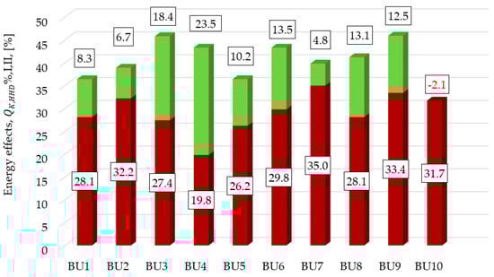 The energy effects obtained as a result of deep thermal modernization in buildings were determined based on Equation (6):