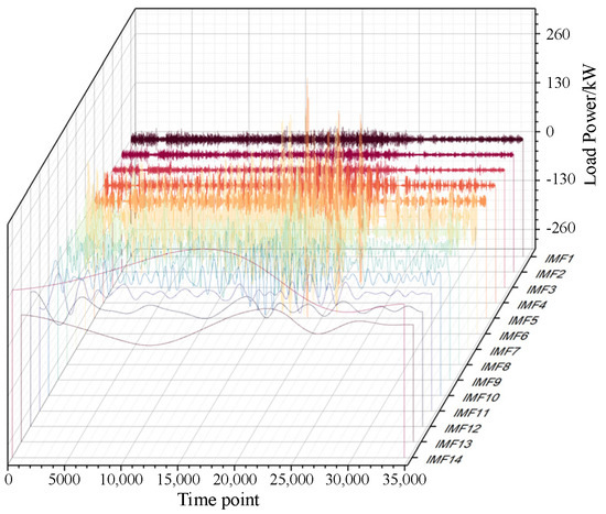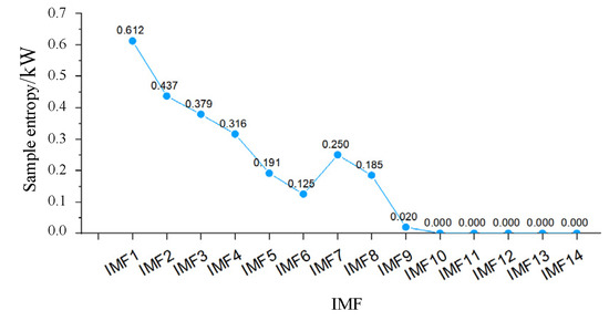 - When is finite, the sample entropy (SampEn) formula is as follows:where the parameter is the observation window dimension and is the distance threshold. Because this paper targets the IMF component time series , the sample entropy calculation only focuses on its changing trend, while the changing trend of sample entropy is not affected by and , so the parameter is set as a regular numerical value, , Std, and the IMF component with sample entropy value close to 0 is divided into low-frequency component, while the rest is divided into high-frequency component.