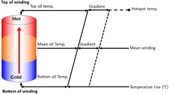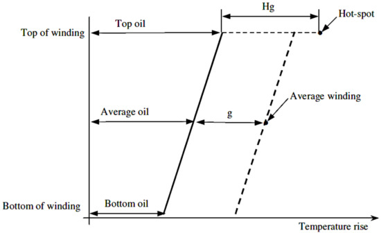 The widely adopted thermal model in the transformer engineering industry is delineated in the IEC standards [3,4,5]. A basic illustration of the temperature dissemination along the transformer winding height is shown in Figure 3. This illustration is centred on the presuppositions enumerated as follows: