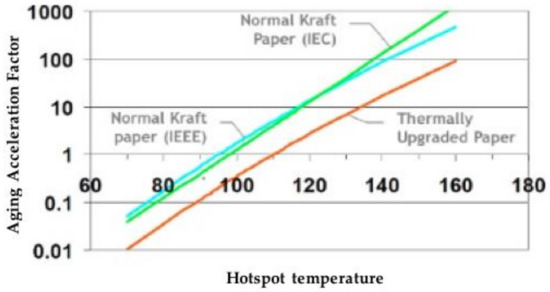 This process is colloquially known by power utilities and transformer manufacturers and persistent attempts have been initiated to stabilize the winding hotspot temperature (WHT) with close monitoring to subsidize low AT, extend the transformer operational lifespan while endowing the possibility of overloading capabilities and make the most of commercial opportunities. The durability tests of cellulose paper versus the WHT are illustrated in Figure 2 [3]. It should be noted that the recent evolution of thermally upgraded cellulose insulation has augmented the strength of cellulose insulation with a WHT of roughly 110 °C with respect to WHTs of 95 °C and 98 °C, as stated by the loading guides.