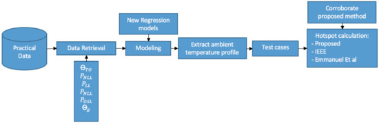 In the current work, the procedure for a standard rated thermal design of units projected to operate in the South African grid utilizing local technical particulars is well-established. The methods for evaluating the , and have been protracted and revised by inserting the regression models and the hourly AT with a view to contemplate the thermal, in-service losses and AT necessities for transformers operating under HLCs in the South African grid. The approaches proposed in this work are indispensable to ascertaining the loading capability of both recently designed and existing transformers. The approaches should be comprehensive and practical, as shown in Figure 5.