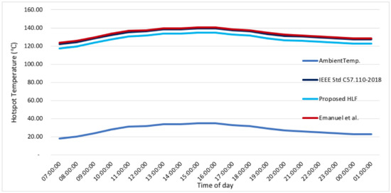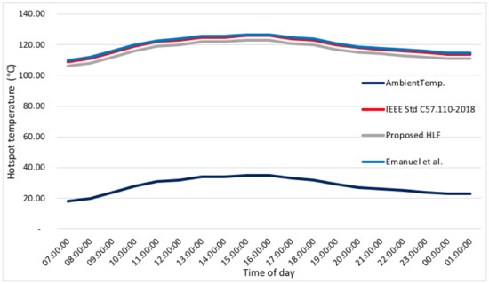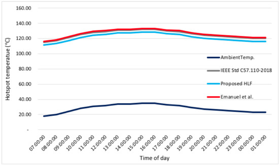 The estimated winding HSTs by the IEEE guide, the novel approach, and the Emmanuel et al. technique are 132.24, 128.38, and 133.34, respectively. It should be underlined that the winding designated for comparability in this unit was the hottest. Figure 10 illustrates the vigorous hourly hotspot temperature.