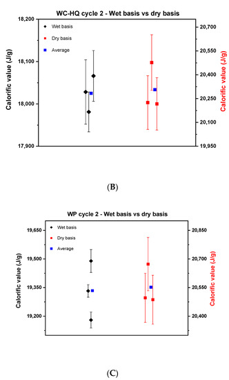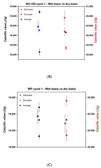Comparison of the calorific values between the wet basis and dry basis in cycle 1. (A) describes the wood chips—industrial quality, (B) the wood chips—high quality, (C) the wood pellets.
