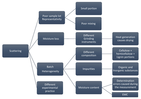 Firstly, due to errors caused during the moisture determination. Such errors depend on the type of the oven used, the heat distribution and the place of the sample inside the oven. Moreover, the sample tray and whether it provides enough surface area for drying the sample properly or not. According to the final report of the METefnet project, a detailed investigation to evaluate the technical procedure for moisture determination is crucial to specify the sources of error and their uncertainties [26]. Such detailed investigation is, however, beyond the scope of this work.
