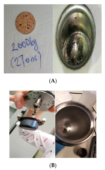 Impact of the applied pellet pressure on achieving complete combustion, (A) shows the pellet under 2 ton (B) shows the pellet under 10 tons, as mentioned in the standard.