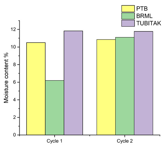 Figure 5 reveals that there is a large difference in the moisture value of cycle 1 between the institutes, especially between BRML and TUBITAK with around 6% difference. In cycle 2 the values were relatively consistent yet not exact with a difference between the values of around 0.6%. This was due to the fact that the samples used in cycle 2 stem from the same batch and were identically prepared as previously mentioned. Different factors possibly caused such variation in the moisture content of WC-HQ between the institutes.
